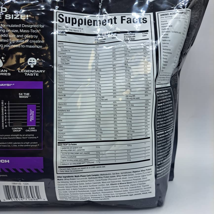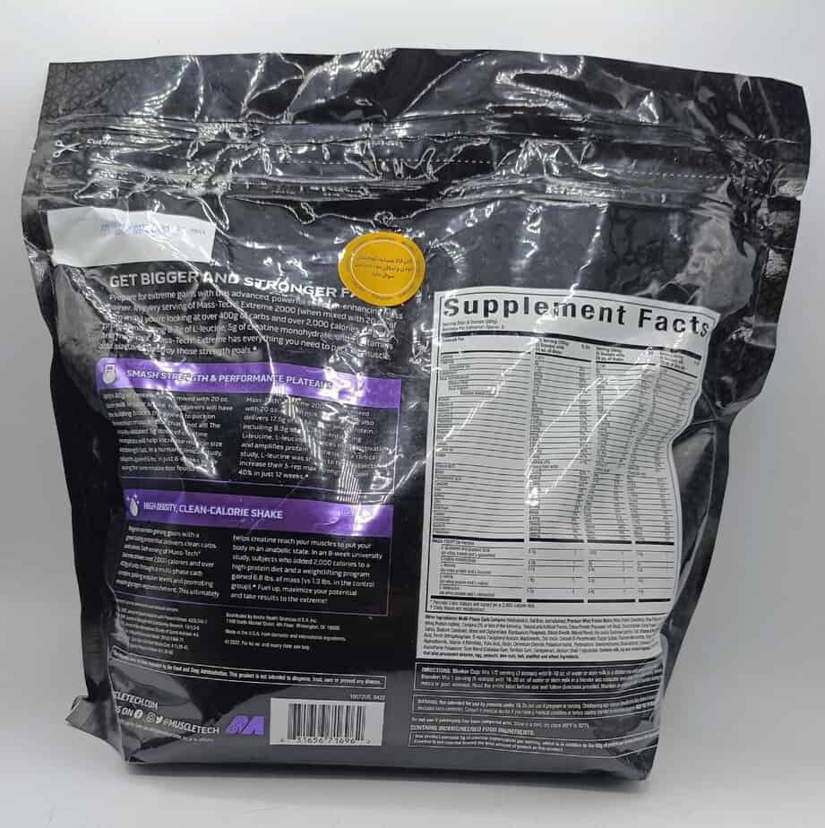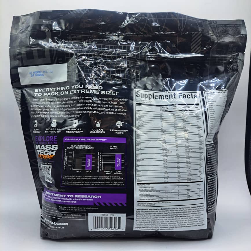 گینر مس تک اکستریم 2000 ماسل تک 9 کیلویی Mass Tech Extreme 2000 با ترکیبی دقیق و استاندارد، طراحی شده تا بیشترین تأثیر را در افزایش وزن و حجم عضلات داشته باشد. این محصول شامل موارد زیر است:
